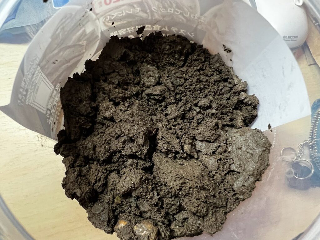 ビニールにどっさり採ってきた河原の土を精製した後に残る「使える」粘土は、たったの一握り。「泥=粘土」ではなく、実際に使える粘土にするには複数の工程と時間が必要なのですね。