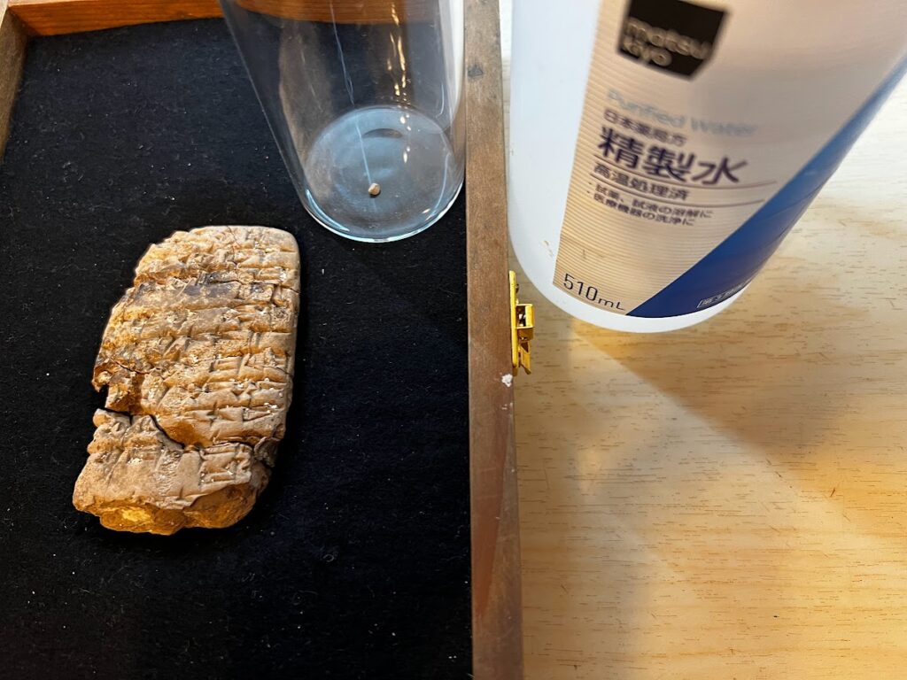 この粘土板は長年各地の講座や授業、展示のために持ち運んだせいで、何かの衝撃で2ミリほどの破片が生じてしまいました。これは好都合! 焼かれているかどうかの判断は、この破片を水に浸けてみればすぐにわかります。形を保てば焼成済み、崩れれば未焼成。