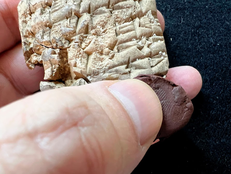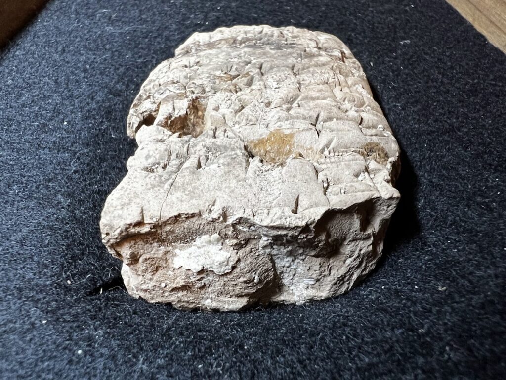 手元にあるメソポタミアの粘土板は、完全なものではなく、下の一部分が壊れて粘土板の中身が見える状態です。文書の完全解読には残念ですが、粘土板の構造を観察するにはむしろ好都合。