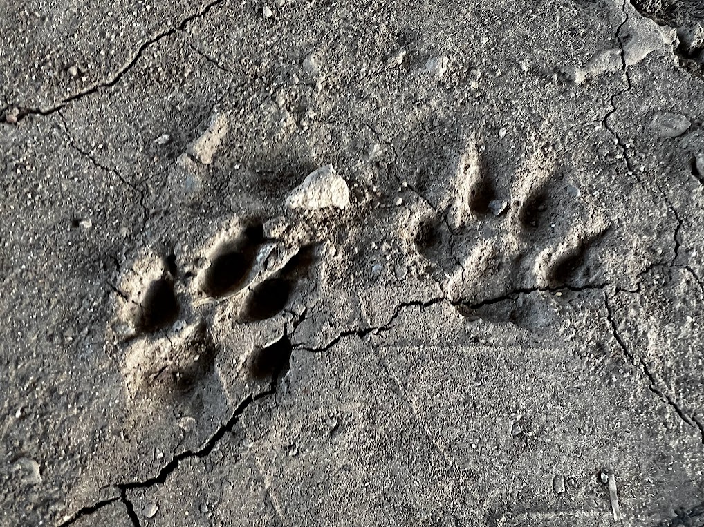 この工程を再現すべく、早速近所の河原へ粘土探しに行ってみます。橋の下を探索してみると、ある足跡が・・・。ぬかるんだ地面を歩いたワンコの足跡が乾燥してそのまま固まっています。これほどきれいに型取りできているということは、良質な粘土が含まれている証拠。
