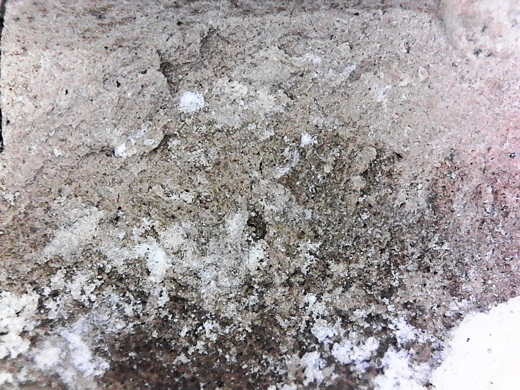 早速中身をのぞいてみると、表面に使われている粘土の粒子と、中身の粒子の大きさが異なっています。粘土板全体の厚さは最大部分で1.8センチ。粗い粒子の芯材部分は1.3センチ、細かい粒子の表層は1~3ミリ(場所により変動)でした。顕微鏡で見てみるとその差は一目瞭然。